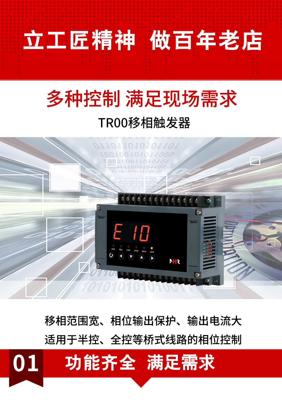 NHR-TR00系列移相觸發(fā)器適用于雙向可控硅、兩個單向可控硅反并聯(lián)等交流相位控制,它分為單相移相觸發(fā)器和三相移相觸發(fā)器兩種類型,采用DIN35mm導軌方式安裝。產品具有鋸齒波線性好、移相范圍寬、控制方式簡單,相位輸出保護、輸出電流大等優(yōu)點。它可與多種溫度控制器配合使用,廣泛應用于電爐、窯爐、工業(yè)爐等行業(yè)的溫度控制。