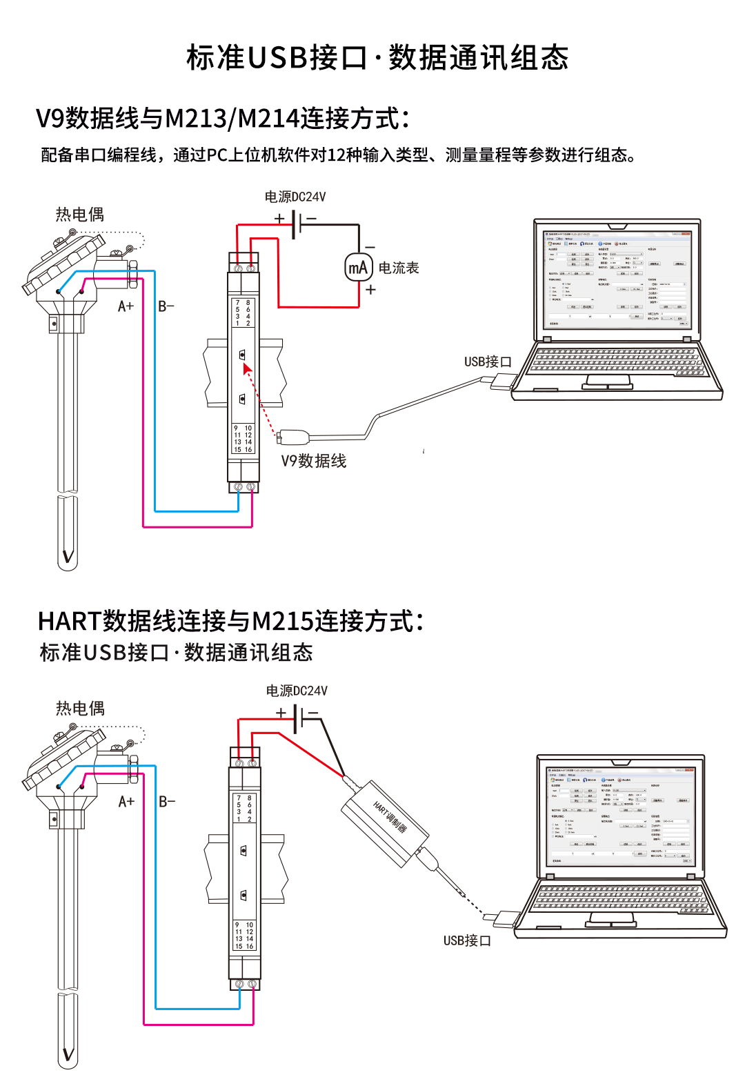 回路供電溫度變送器分為M213智能溫度變送器、M214隔離智能溫度變送器、M215 HART智能溫度變送器,變送器將現(xiàn)場的熱電阻或熱電偶信號經(jīng)過隔離放大處理,轉(zhuǎn)換為與溫度成線性的二線制4-20mA(HART)信號輸出至控制系統(tǒng)。