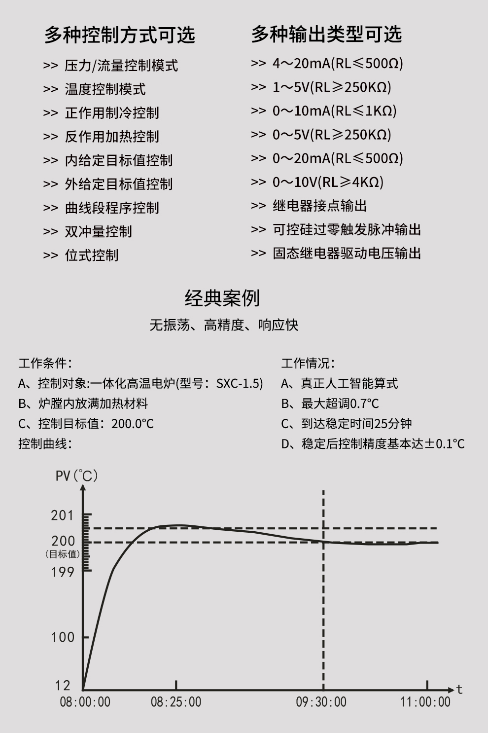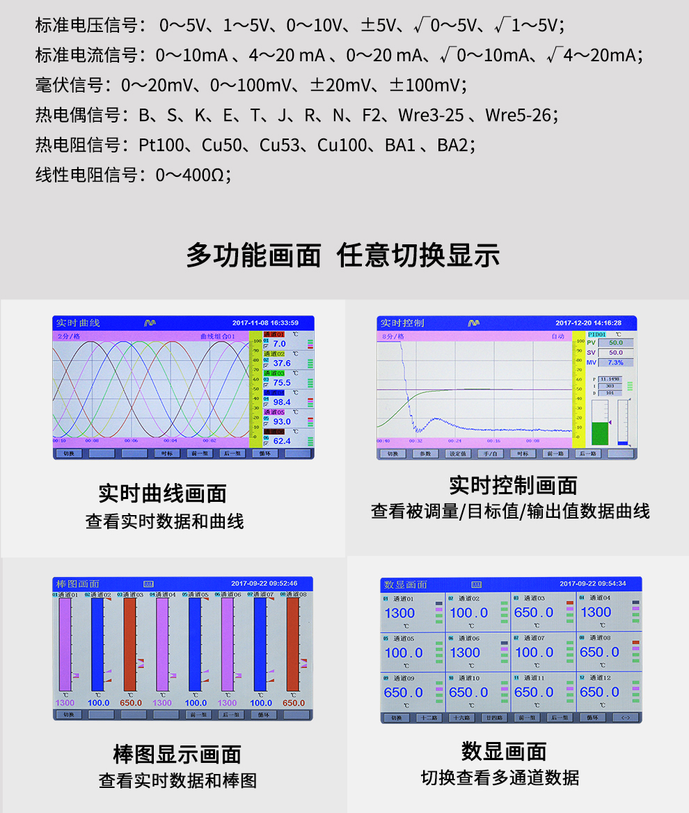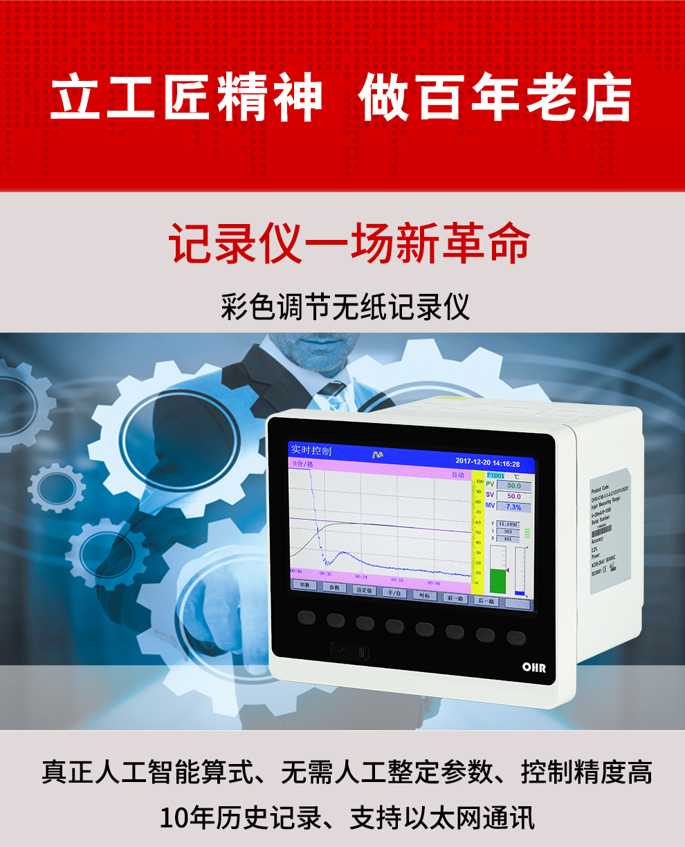 OHR-H300系列彩色調(diào)節(jié)無紙記錄儀采用真正的人工智能算式,儀表啟動(dòng)自整定功能,可根據(jù)被控對象的特性,自動(dòng)尋找最優(yōu)參數(shù)以達(dá)到很好的控制效果,無需人工整定參數(shù)。控溫精度基本達(dá)±0.1℃,無超調(diào)、欠調(diào),達(dá)國際先進(jìn)水平。24路萬能輸入(可組態(tài)選擇輸入:標(biāo)準(zhǔn)電壓、標(biāo)準(zhǔn)電流、熱電偶、熱電阻、毫伏等)其中可帶8路控制輸入。