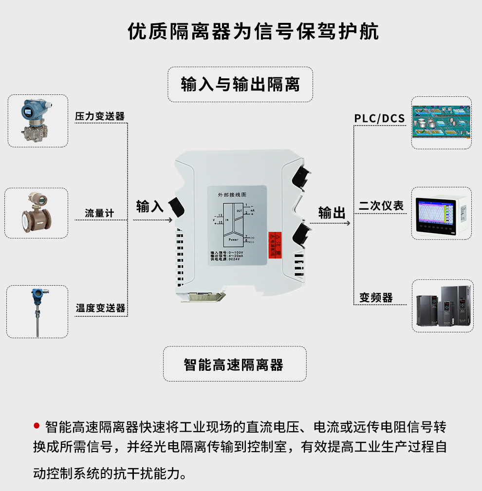 OHR-M38系列智能高速隔離器將工業(yè)現(xiàn)場(chǎng)的直流電壓、電流或遠(yuǎn)傳電阻信號(hào)轉(zhuǎn)換成所需信號(hào),經(jīng)隔離傳輸?shù)娇刂剖?,有效提高工業(yè)生產(chǎn)過(guò)程自動(dòng)控制系統(tǒng)的抗干擾能力。