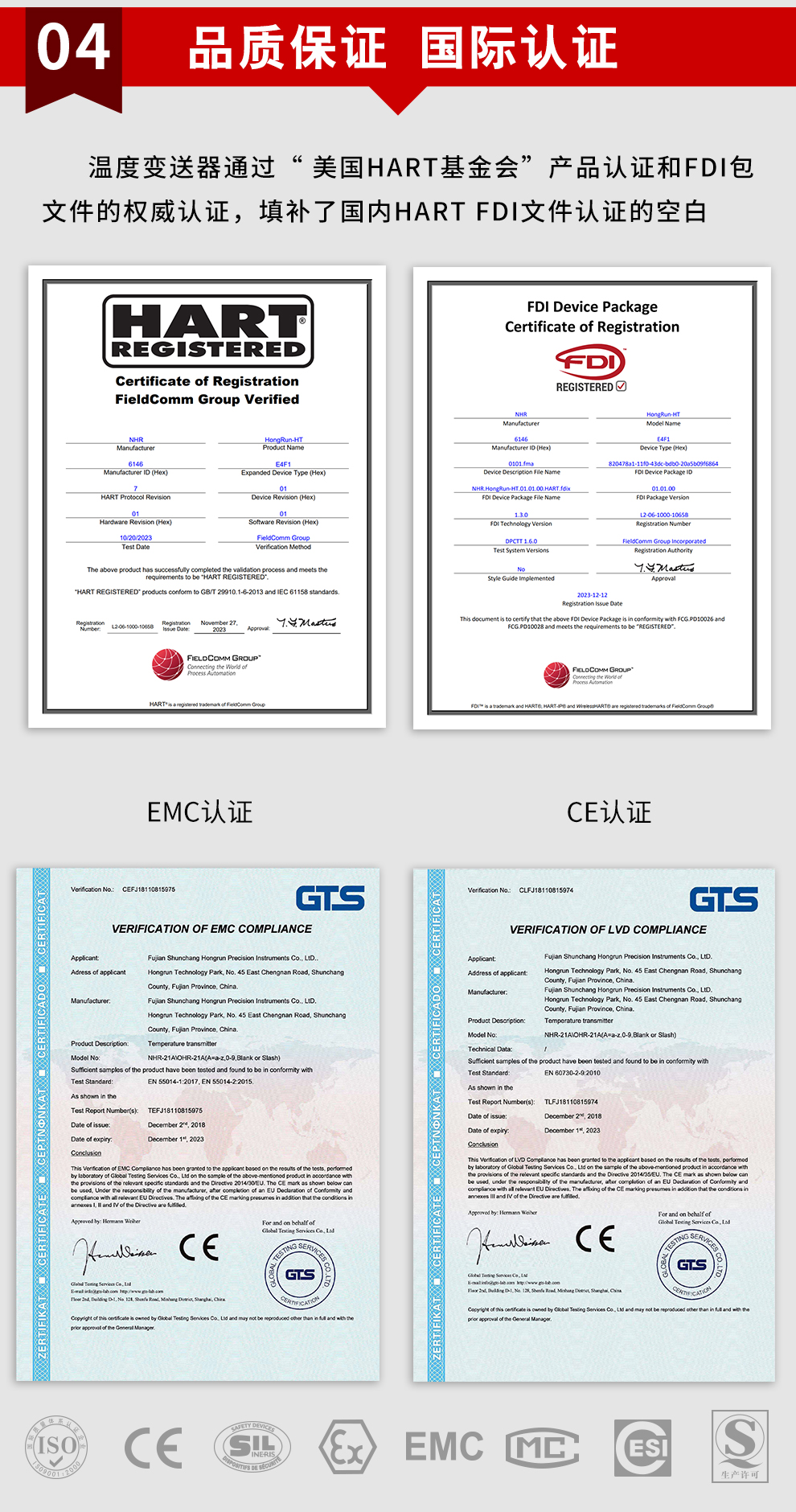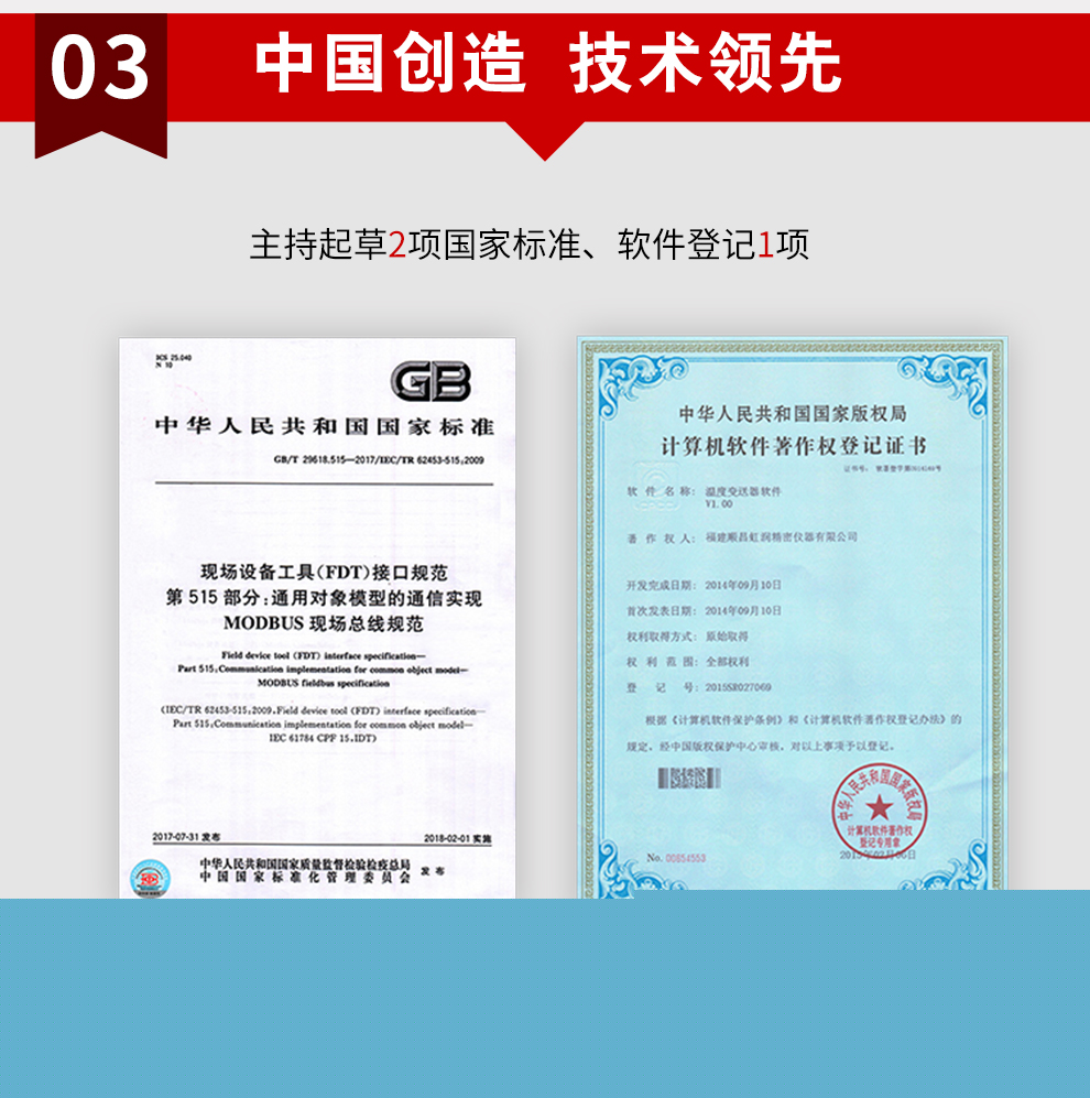 虹潤(rùn)公司是專(zhuān)業(yè)生產(chǎn)溫度變送器的國(guó)家專(zhuān)精特新“小巨人”企業(yè)。生產(chǎn)的現(xiàn)場(chǎng)顯示隔離溫度變送器,具有可修改輸入信號(hào)類(lèi)型,測(cè)量精度高,穩(wěn)定性好,帶HART或RS485通訊計(jì)等特點(diǎn)。該產(chǎn)品不僅通過(guò)德國(guó)萊茵 CE 認(rèn)證與 SIL 功能安全認(rèn)證,還獲得具備減震抗干擾能力的溫度變送器、信號(hào)隔離器、一種二端子模塊、無(wú)源信號(hào)隔離器等3項(xiàng)國(guó)家發(fā)明專(zhuān)利。主持起草物聯(lián)網(wǎng)智能溫度儀表、現(xiàn)場(chǎng)設(shè)備工具(FDT)接口規(guī)范、工業(yè)過(guò)程測(cè)量和控制系統(tǒng)用溫度變送器等3項(xiàng)國(guó)家標(biāo)準(zhǔn),以及通信系統(tǒng)多通道數(shù)據(jù)采集控制終端規(guī)范軍用標(biāo)準(zhǔn)。參與國(guó)際5G標(biāo)準(zhǔn)制定,取得高精度溫度變送器等3項(xiàng)相關(guān)軟件著作權(quán)。產(chǎn)品廣泛應(yīng)用于石油、化工、電力、冶金、制藥、食品、水處理等各種工業(yè)領(lǐng)域。