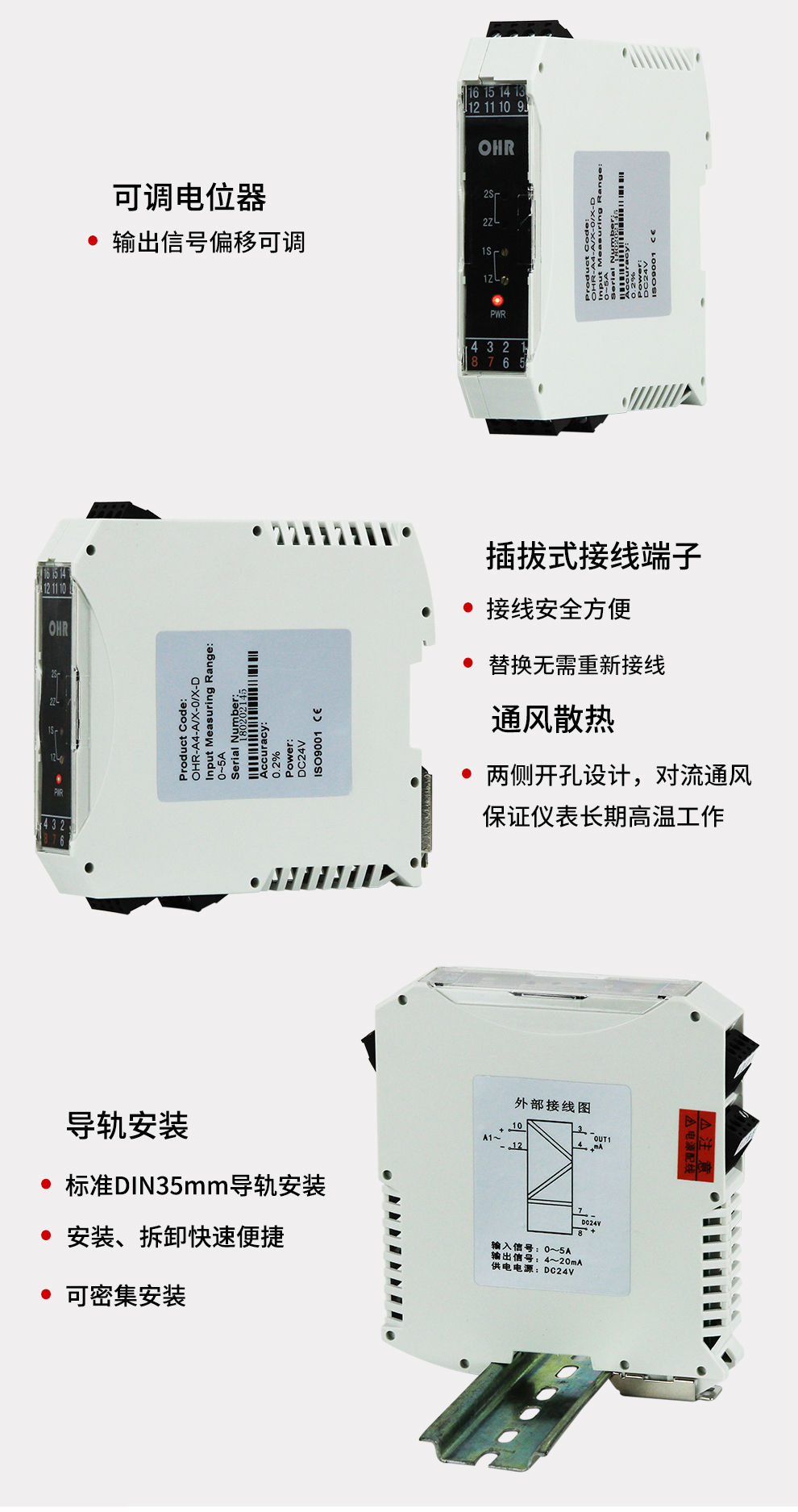 OHR-A4系列簡易型電量變送器用電磁隔離技術,對電網(wǎng)或電路中的交流電流、電壓進行實時測量,它可將被測交流電流、電壓轉換成按線性比例輸出的直流電流或者直流電壓信號,產(chǎn)品具有高精度、隔離電壓高、相應時間快、低漂移、低功耗等特點。