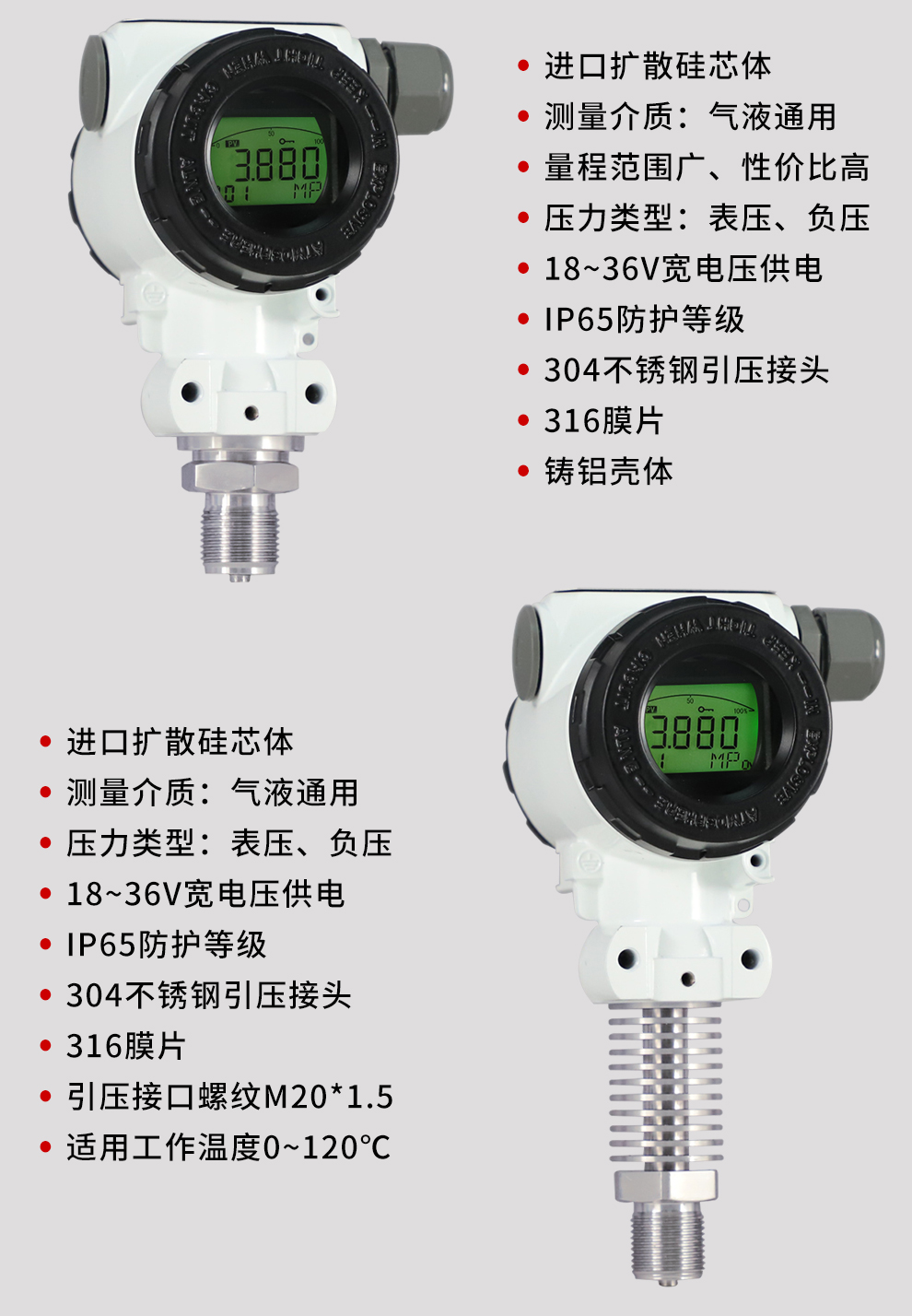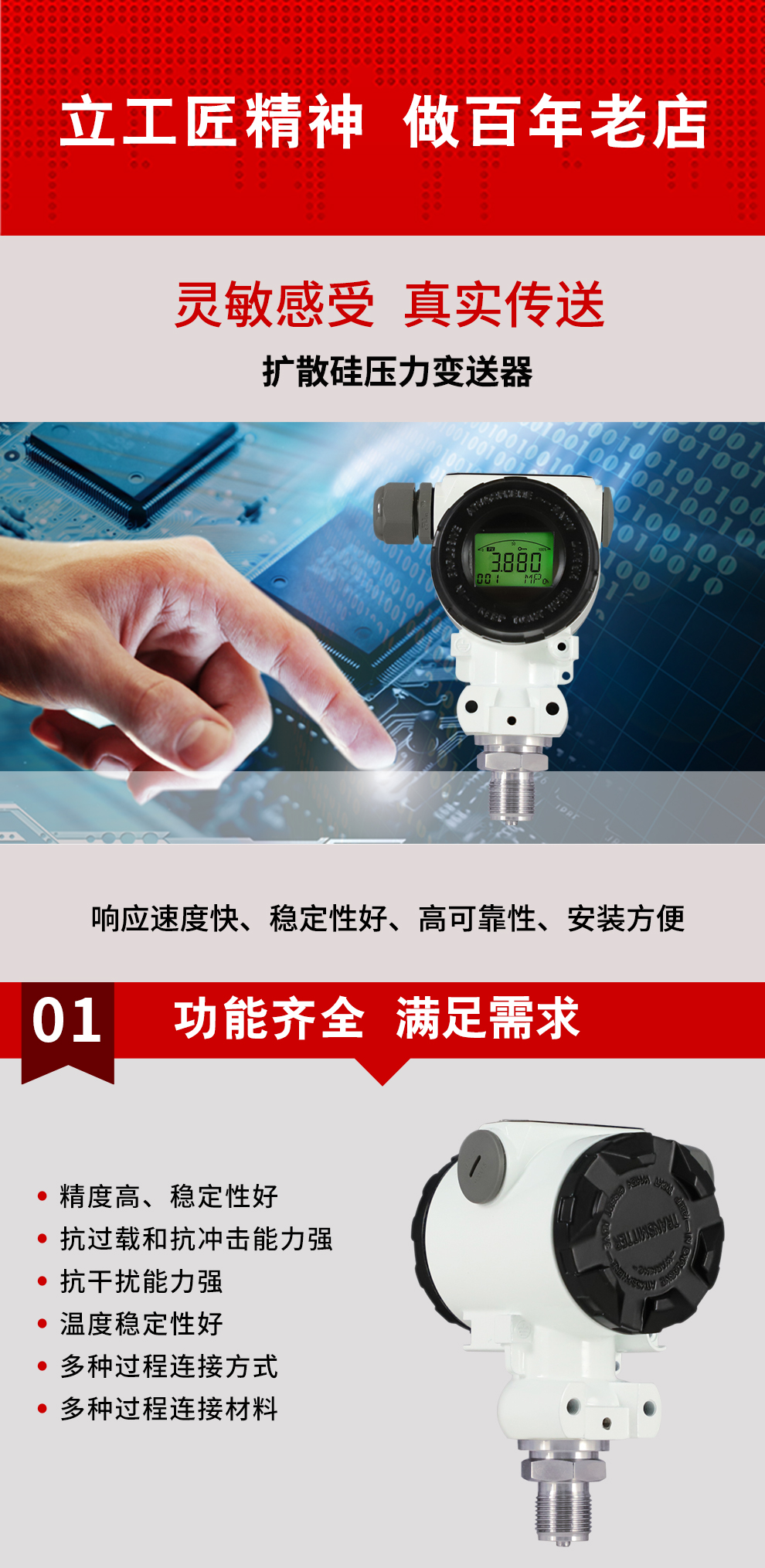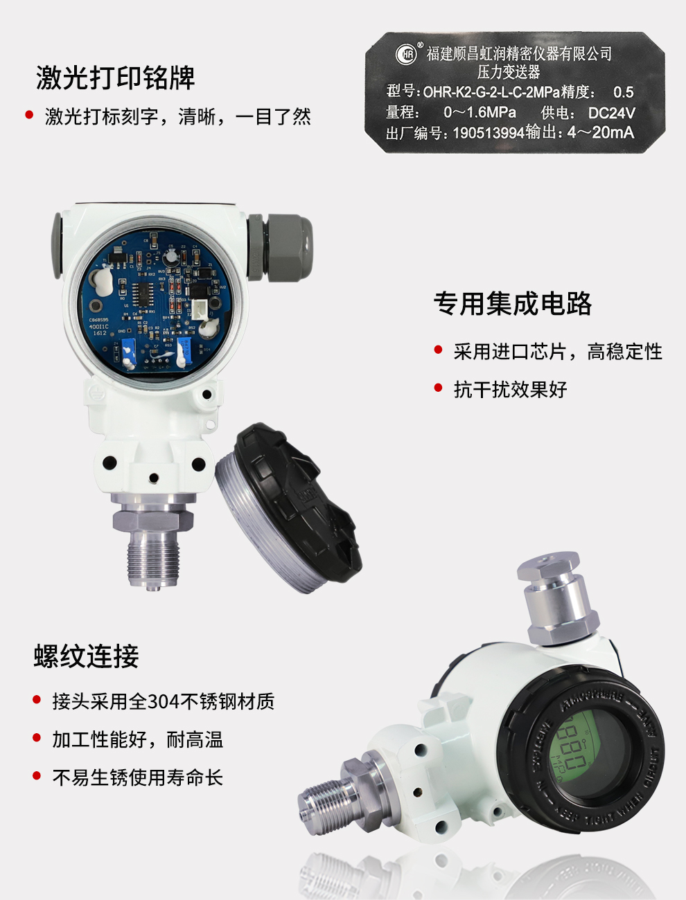 虹潤(rùn)公司是專業(yè)生產(chǎn)壓力變送器的國(guó)家專精特新“小巨人”企業(yè),生產(chǎn)的擴(kuò)散硅壓力變送器,具有精度高,穩(wěn)定性好,響應(yīng)速度快,高可靠性,抗過載和抗沖擊能力強(qiáng),安裝方便等特點(diǎn)。產(chǎn)品獲得一種數(shù)字顯示低功耗壓力表、一種信號(hào)發(fā)生器裝置等2項(xiàng)國(guó)家發(fā)明專利,主持起草工業(yè)過程控制系統(tǒng)用模擬輸入兩位或多位輸出儀表、工業(yè)過程測(cè)量和控制系統(tǒng)用壓力/差壓變送器等2項(xiàng)國(guó)家標(biāo)準(zhǔn),通信系統(tǒng)多通道數(shù)據(jù)采集控制終端規(guī)范軍用標(biāo)準(zhǔn),以及現(xiàn)場(chǎng)設(shè)備集成等5項(xiàng)智能制造國(guó)家標(biāo)準(zhǔn)。參與國(guó)際5G標(biāo)準(zhǔn)制定,取得數(shù)顯壓力表等2項(xiàng)相關(guān)軟件著作權(quán)。產(chǎn)品廣泛應(yīng)用于化工、食品、制藥、電力、設(shè)備配套、供暖、水處理、樓宇等行業(yè),需精準(zhǔn)測(cè)量流體壓力的現(xiàn)場(chǎng)。